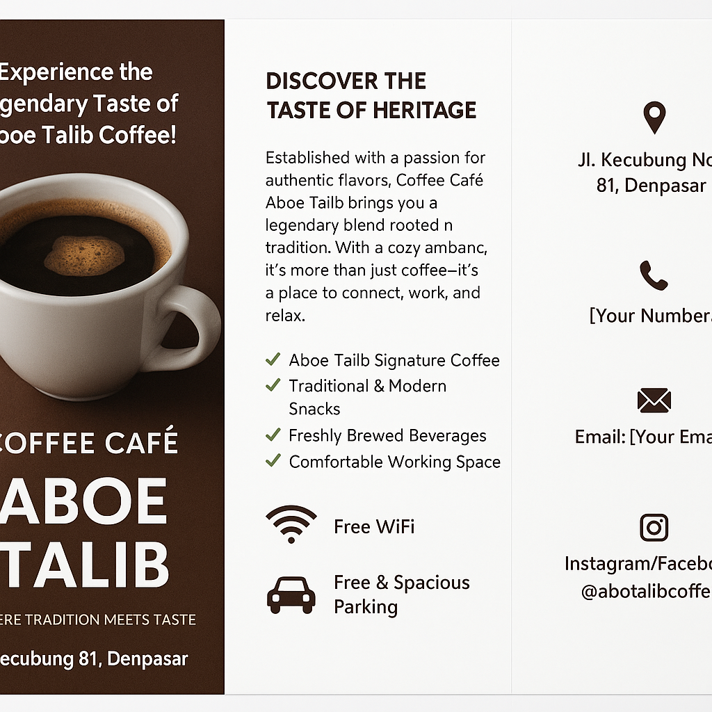 Nikmati kopi khas legendaris Aboe Talib dengan cita rasa autentik yang tak terlupakan, ditemani aneka snack pilihan.